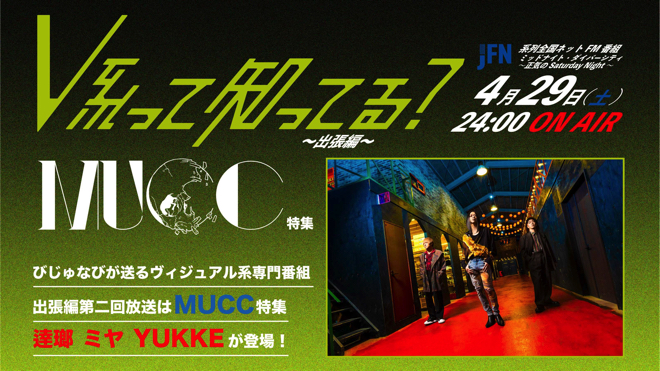 ラジオ番組『#V系って知ってる?』の“出張編”第2弾が、4月29日24時よりJFN系列25局で放送される。ゲストとしてMUCCの逹瑯(Vo)とミヤ(G)、YUKKE(B)が生出演するという。