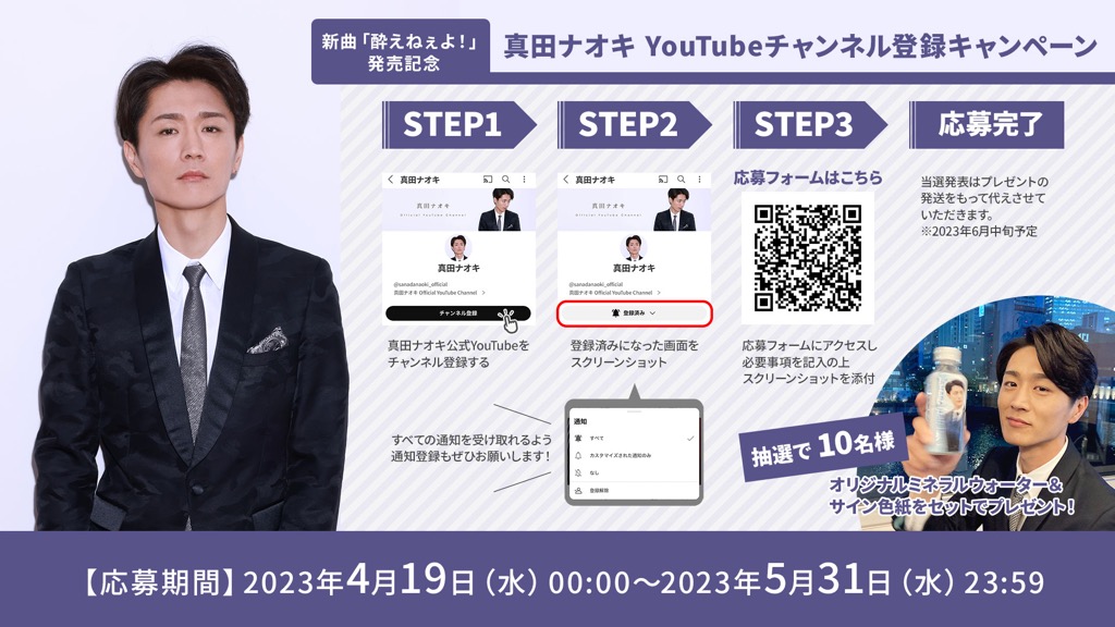 また、新曲の発売にあわせ「真田ナオキ YouTubeチャンネル」も開設された。1本目の動画として、「酔えねぇよ!」ミュージックビデオのメイキング映像と、自身のコメント動画が公開された。現在、チャンネル登録キャンペーンを開催中で、キャンペーン期間は、5月31日まで。このチャンネルでは今後もオリジナルコンテンツが公開されていく。