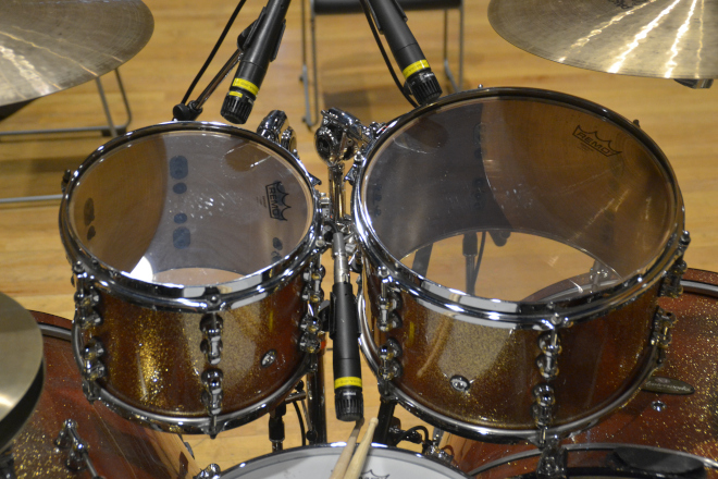 角田:はい。私のセットのタム類はリファレンスシリーズをベースとしています、細かく言うとタムの10インチがメイプルとバーチの混合。13インチがメイプルとマホガニー。そのプライ数の比率が4:2。フロアタムは6プライでマホガニーが2、メイプルが4という組み合わせになっています。