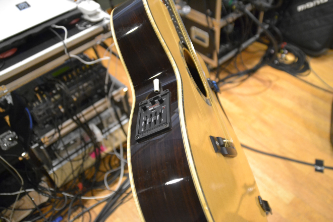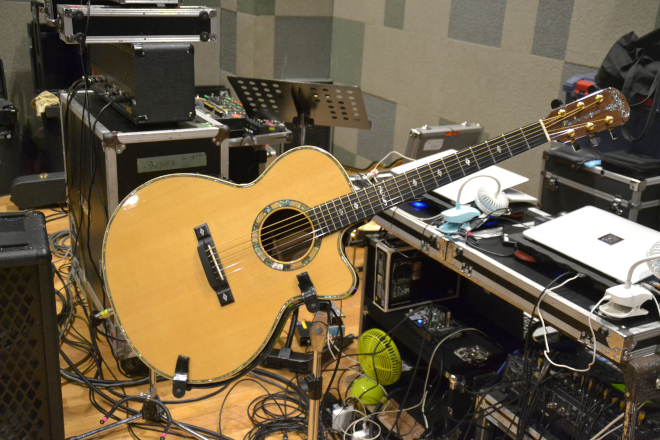 五十嵐:これ、ベンチャーズモデルなんですよ。鳴りが良過ぎるとライブだとハウっちゃうので、ボディが薄めになっています。ピックアップはピエゾとボディに付いているものの2種類。ライブで使うアコギはボディが鳴り過ぎると、他で出している爆音を拾ってハウっちゃうんです。かーくん(諸星和己)のバックの時もバンドサウンドでアコースティックを弾く曲があって、結構軽快な曲なんですけど、モニターから出る音をアコギ以外消してもらっています。そういう点で、このベンチャーズモデルは、すごくバランスが良いです。