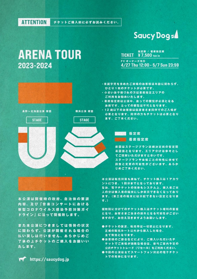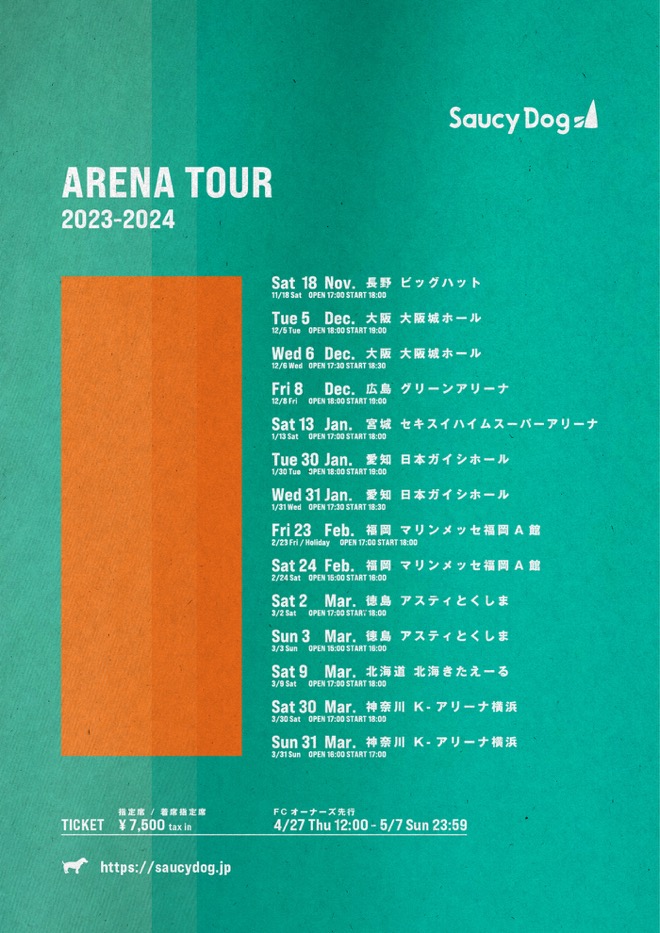 <ARENA TOUR 2023-2024>は、11月18日の長野ビッグハットを皮切りに、翌2024年3月のKアリーナ横浜まで、全国9ヵ所14公演の規模で行われるもの。総キャパシティが約13万人におよぶ自身最大規模のアリーナツアーとなる予定だ。チケットのSaucy Dogオフィシャルファンクラブ“サウシードックオーナーズ”先行予約は4月27日正午から。
