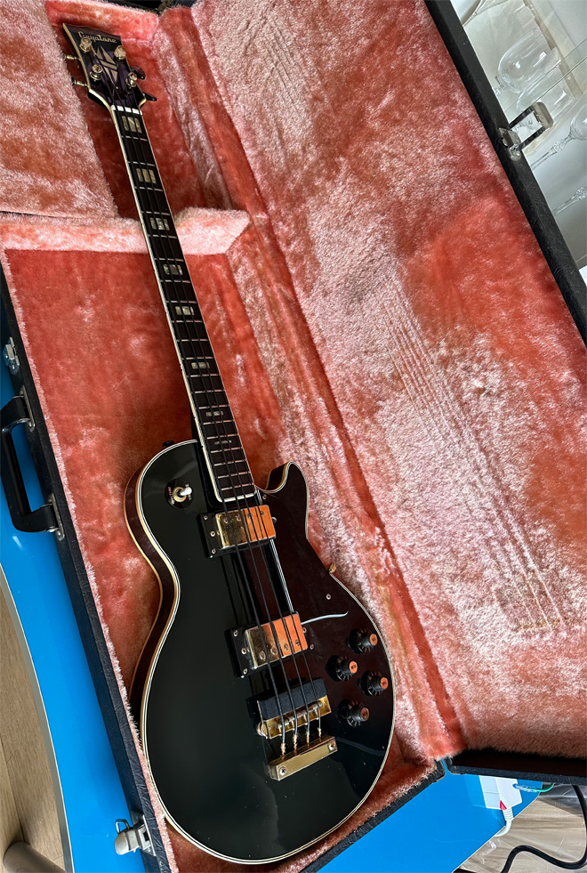そんな日に届いたのがこのベース。完っ全に一目惚れです。レスポールベースって、あんまり見ないですよね。見たとしても、ピックアップはブリッジ寄りになるしピックガードないし…私はそれじゃあ納得できません。このピックガードがアイディンティティ。ポジションマークも、ビザールなペグも、バインディングも、全てがもう麗しい。最早官能的。