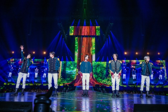 巨大LEDパネルにメリーゴランドが回るオープニング映像が流れ出すと、観客が持つペンライトがブルー一色になり、目の前には夢のようなファンタジックな世界が広がる。宮殿にいるメンバーをとらえた映像、その映像の中と同じ衣装を身につけた5人の貴公子がステージに姿を現すと、舞台が煌めき大歓声が巻き起こった。そして、ライブは「5時53分の空で見つけた君と僕 [Japanese Ver.]」で幕開け。オレンジとブルーが溶け合うような照明で客席を幻想的なマジックアワーへと包み込むと、軽快なステップワークとジャンプのまま、大人になっても子供時代が終わってほしくない気持ちをゲームに例えて歌った「Can’t We Just Leave The Monster Alive?」を披露した。