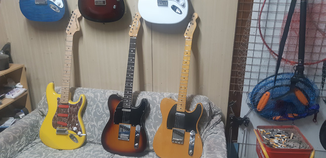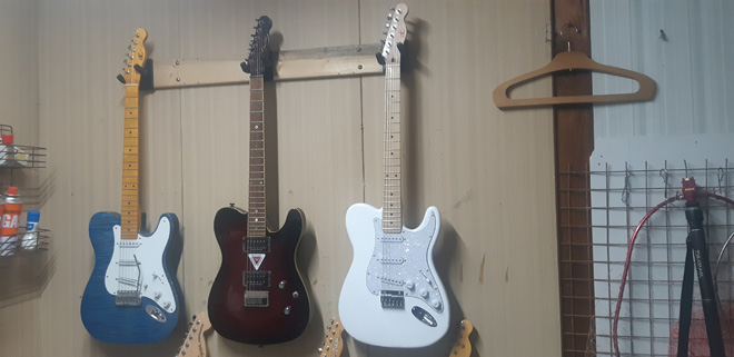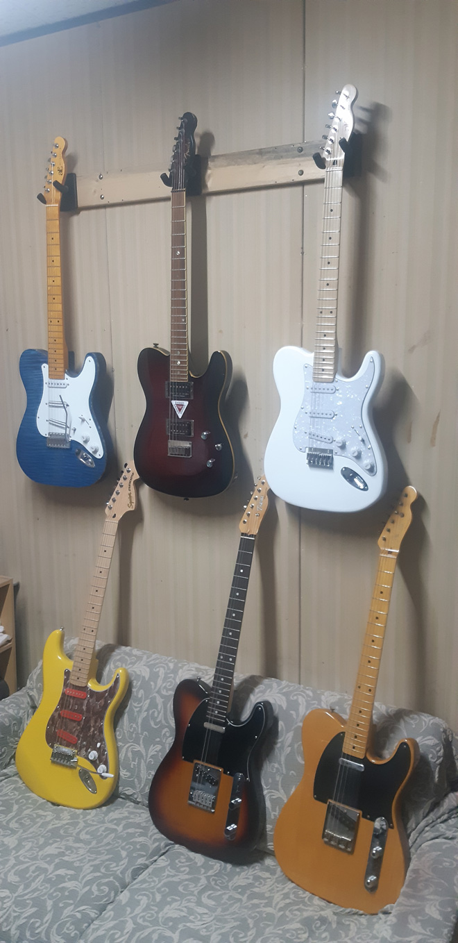 6本中テレシェイプが5本という、焦点がビシッと合った魅惑のギター群ですね。中でも自作ギターが2本ともテレ・ボディにストラト・アッセンブリというところに、ストラトの完成度をテレで実現したい的な性癖が見て取れます。こういうギターが至高じゃんって思っている人、世界中にわんさかいると思うんですよね。純白の美少女テレラトちゃん、略してテラちゃん、私も一本欲しいです。追:フェンダーがテレと言うのならそれがテレ。コレ正解。逆にフェンダー/スクワイア以外は、誰がなんと言おうとそれはテレキャスターではありません。これ、楽器業界の常識。(JMN統括編集長 烏丸)