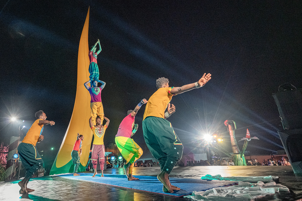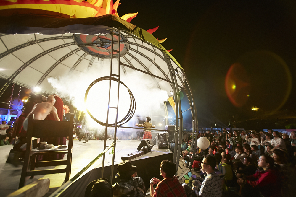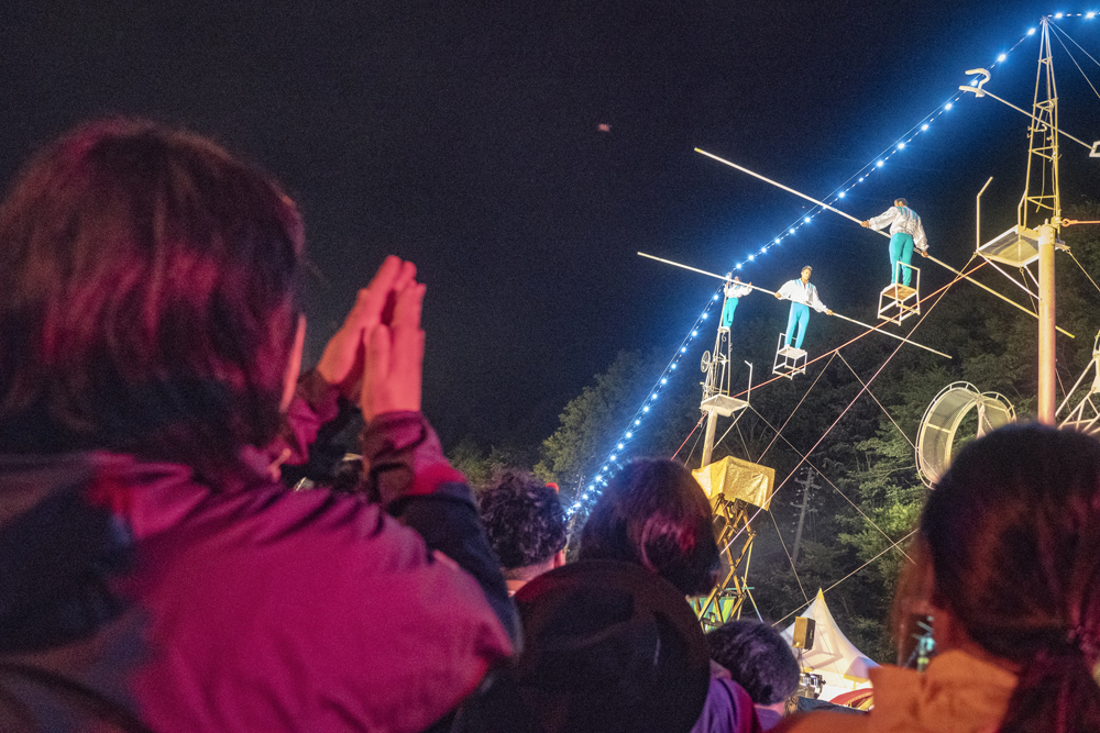 音楽以外のアトラクションも満載なのがカオティックなTHE PALACE OF WONDERの醍醐味。狂気のサーカス集団“THE CIRCUS OF HORRORS”の最高に下世話なショーに全てがどうでもよく思えてきたり、メッシュの球体ボール内を複数のバイクが縦横無尽に走り回る“グローブ・オブ・デス”に手に汗握ったり、“マルチネス・ブラザーズ”の家族の絆にも触れられるアクロバットに感動したり、一生ものの刺激的な思い出がいっぱい。場内のムードもアナキズム全開で、スカル型のエントランスや、廃材から作られた巨大アリ、怪しいデザインの回転遊具などに囲まれたフォトジェニック過ぎる魅惑の非日常空間は、その直前までメインエリアでどれだけ世界レベルのステージを楽しみ尽くしていても、甘い蜜に引き寄せられるように足を踏み入れてしまう。いつしか、THE PALACE OF WONDERを満喫したいがために、わざわざ遅がけで苗場へやって来る人もいるほどかけがえのない大人の社交場にもなっていた。思い出を辿ると、奥の茂みのほうにひっそりと佇む日本酒を提供する穴場の酒バー「POSH TOMATO」も通のファンが多いスポットだった。