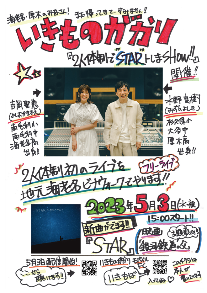 フリーライブ当日、会場が沢山のファンで埋め尽くされ、開演時間を迎えると「みなさん、お久しぶりです!いきものがかりです!」というMCと共に吉岡聖恵と水野良樹がステージに登場。ピアノとボーカル2人だけの編成で、1曲目には「笑顔」をパフォーマンス。楽曲の終盤では集まったファンとともにシンガロングする光景も。続いて、2人体制初の新曲「STAR」を初披露すると、リリースされたばかりの新曲の披露に会場には大きな拍手が響きわたる。