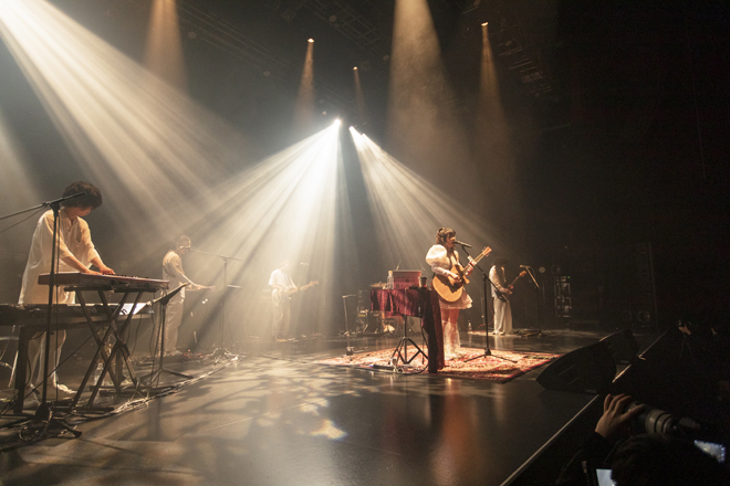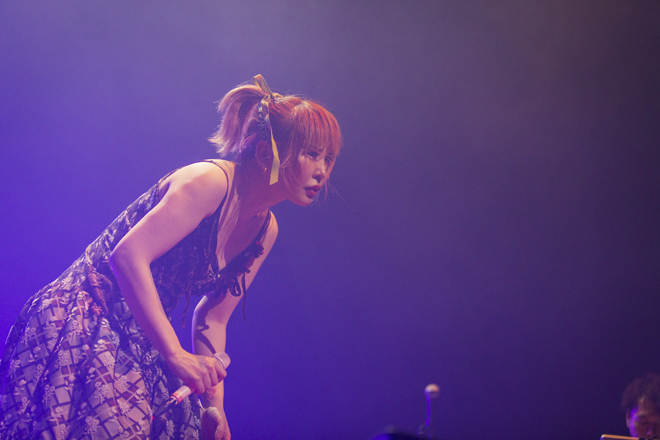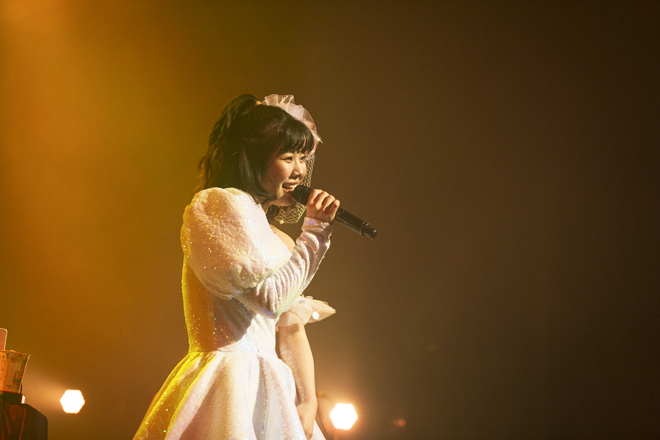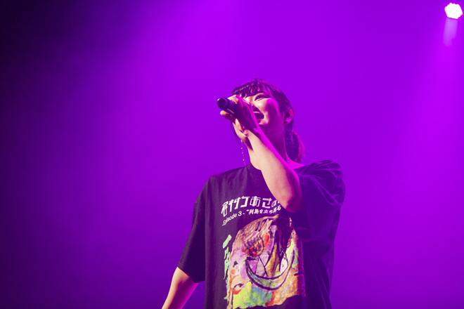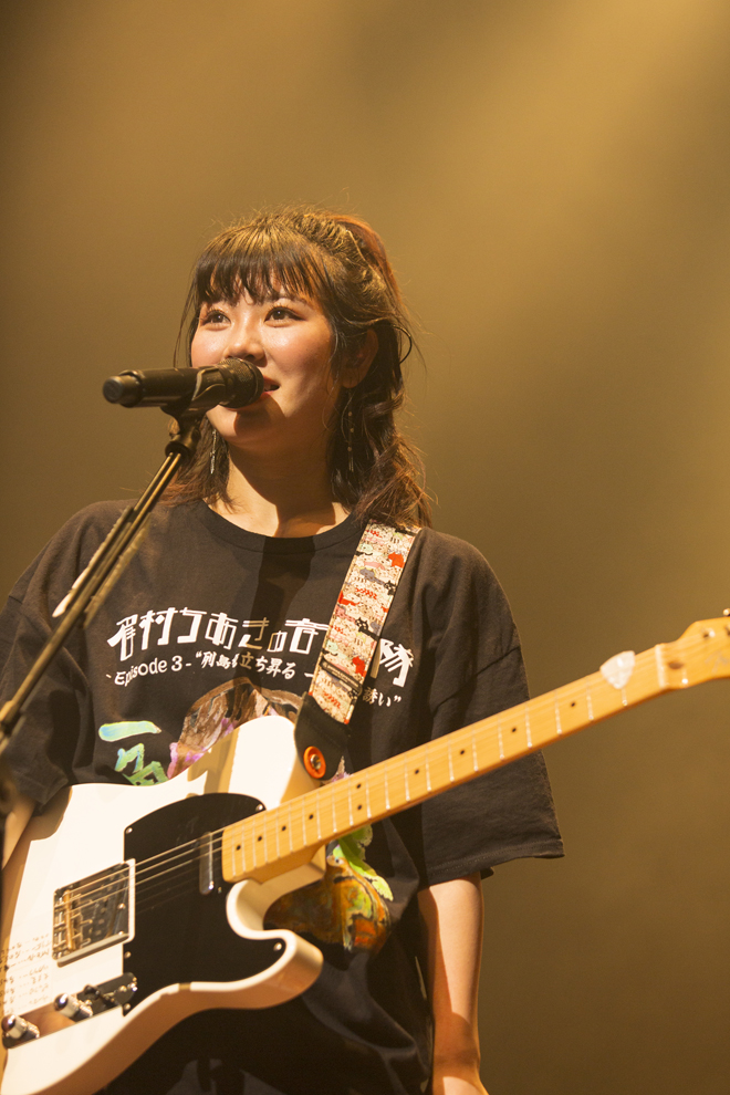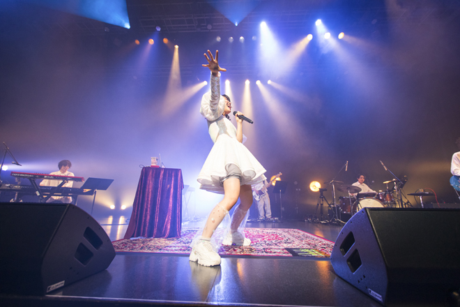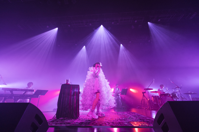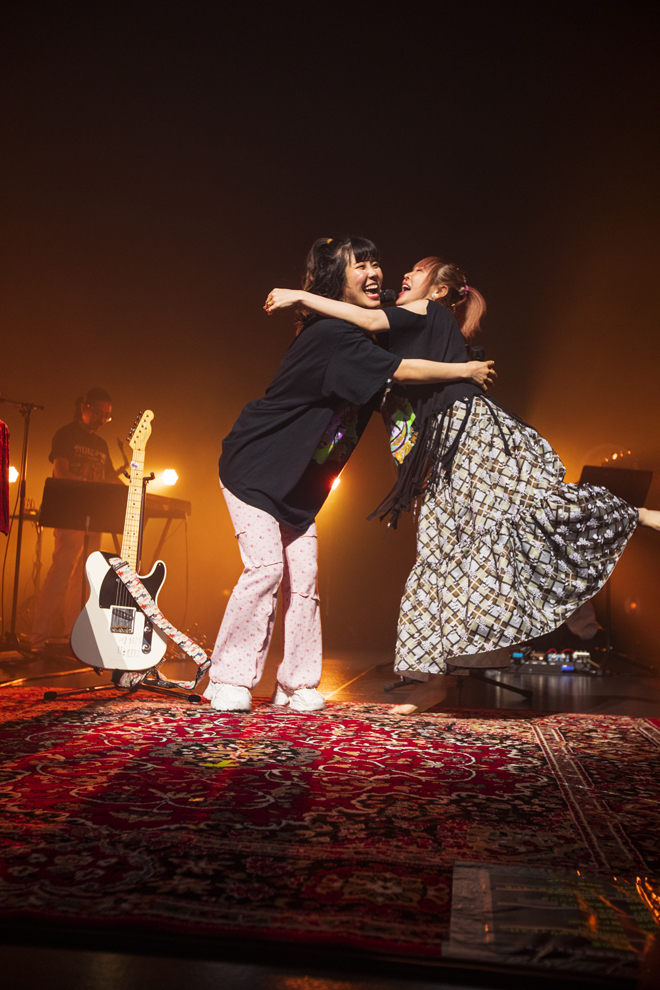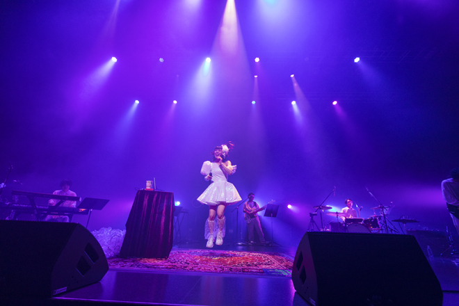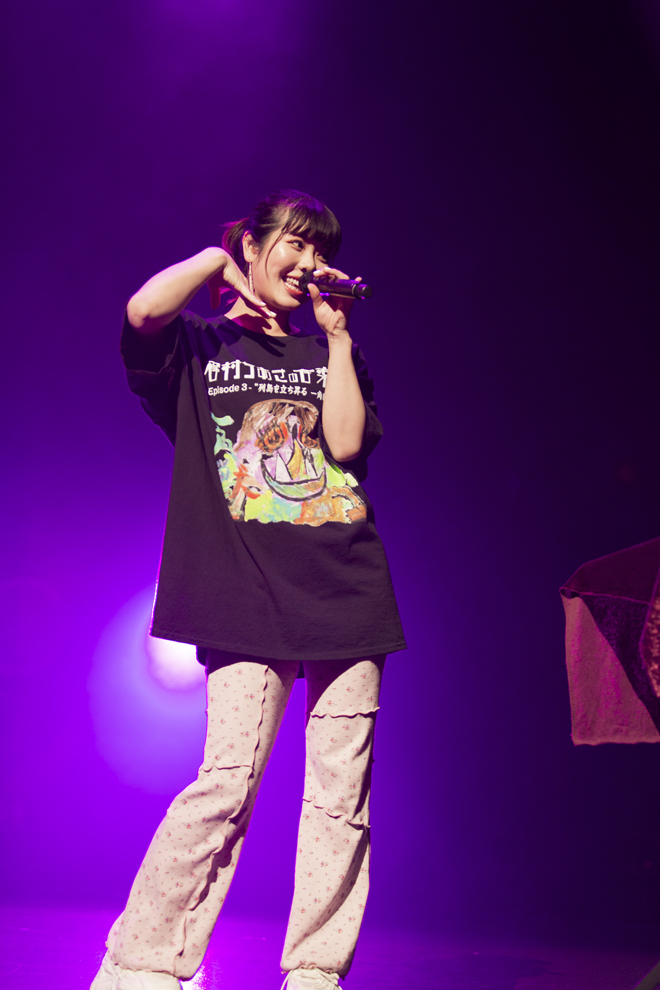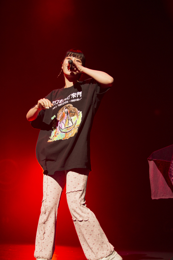 絶妙なタイミングで発せられたマユムラーの「おい!おい!おい!おい!」「いやいやいやいや!!!!!!」という歌声が盛り上がりを加速していた「顔ドン」。バンド演奏での初披露となった「肉喰え」を経て迎えた小休止。他人に何か嫌なことをされて傷ついても、その場は笑ってやり過ごしてしまい、家に帰って泣く性格である旨がMCで語られた。「今日来てくれたみんな、いろんな人たちがいるかもしれないけど、多分私と同じでしょ? あっ! そういえば、同一人物だったわ。家に帰って泣く人が他にもいるんじゃないかなと思って作ったのが「肉喰え」なの。でも、そんなことばっかしてたらつらいじゃん? だからたまには自分をもてなしてほしいなと思って作った曲。ここからはプリンセスコーナーです」と説明し、兼松のピアノ伴奏で届けられた「おもてなし子」は、優しい温もりを感じさせてくれる曲だった。
