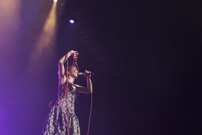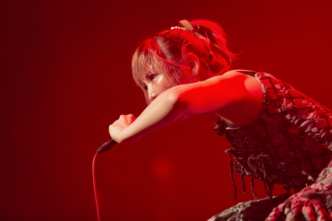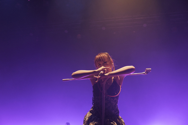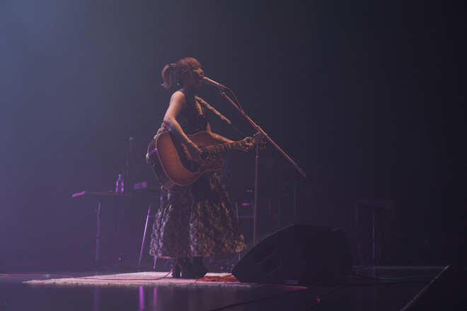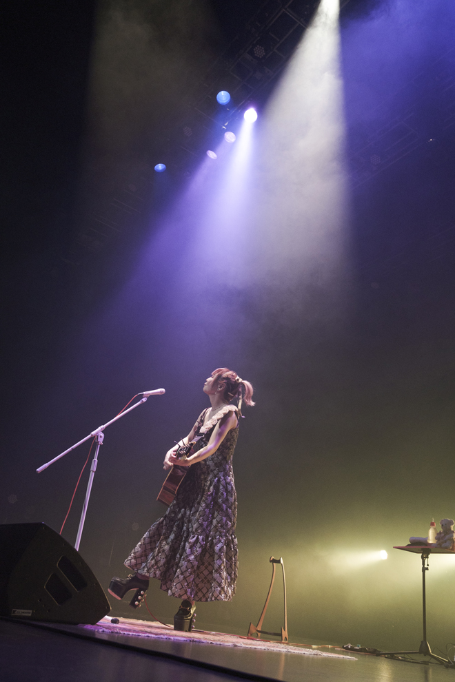 薄暗がりのステージに登場した大森靖子。手にしたアコースティックギターのボディーを叩いてビートを刻んだり、弦をスクラッチしたりもしつつ、歌い始めたのは「VAIDOKU」だった。そして、ピリリと震える空気を鋭く切り裂いたギターの音。力強く弦をストロークしながら「TOKYO BLACK HOLE」へと雪崩れ込んだ瞬間、会場の空間が一気に拡張したような気がした。トレードマークになっているギブソン・ハミングバードを荒馬のように乗りこなし、多彩なニュアンスの音を歌声と共にスパークさせる姿は、“弾き語り”という言葉の真の意味をまざまざと実感させてくれた。弾き語りで使用する楽器は、単に和音などを奏でるための歌の補助ツールではない。表現したい世界へと切り込んで行く武器、血の通った色彩や線を描写する絵筆、歌声を加速するブースターなのだ。「マジックミラー」で客席に迫ってきた音圧、漲っているエネルギーは桁外れだった。