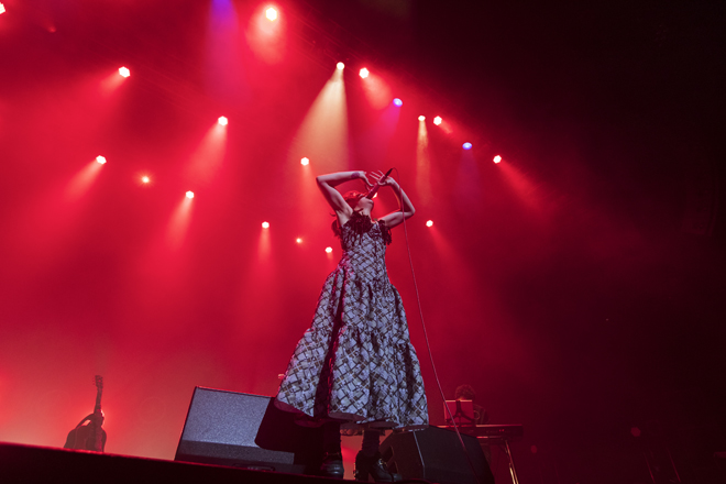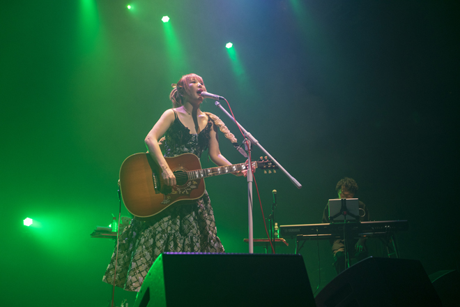 「魔法が使えないなら」も弾き語りでスタートしたが、途中でsugarbeans(Pf)が登場。彼のピアノが加わった瞬間、大森の表現が新たな形態を煌めかせる様に息を呑んだ。寄り添うピアノを全身全霊で感じながら、色合いを豊かに変化させる歌声が美しい。アカペラから始まり、ピアノが合流していった「夕方ミラージュ」では、ギターをスタンドに置いて身軽になった彼女がステージ全体を使って踊り、横たわり、腕を伸ばし、マイクのケーブルを波打たせ、髪を振り乱し……あらゆる要素が曲の世界を表現していた。その後に「NIGHT ON THE PLANET」「ひらいて」も続いたが、巨大なキャンバスに壮大な絵画が描き上げられていくような感覚になったのが、ワクワクする体験として思い出される。印象的なピアノイントロから始まった「死神」も、歌声とsugarbeansの演奏のコンビネーションが素晴らしかった。そして、ラストに披露されたのは「Rude」。“生きろ!”と胸倉を掴んでくるかのような歌声が優しかった。演奏が幕切れた瞬間、会場内に広がっていた綺麗な余韻。観客にお辞儀をした後、ステージに対しても深々とお辞儀をした大森を、感極まった胸の内を伝える観客の大きな拍手と歓声が見送った。