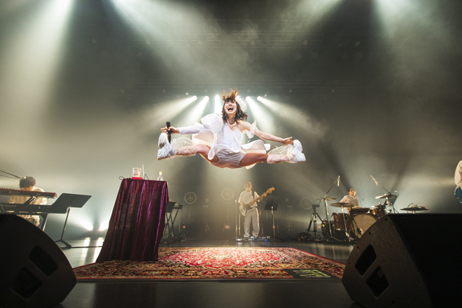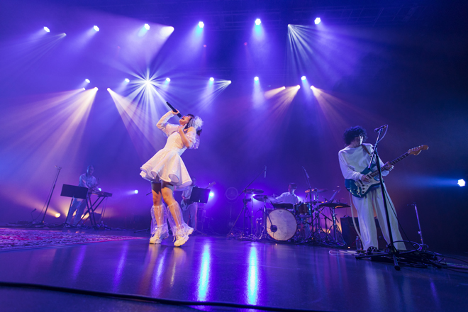 アコースティックギターの弾き語り+PCから流すトラックに合わせて歌うのがライブの基本スタイルである眉村ちあき(以下、ちちゃん)だが、一昨年の9月に行われた中野サンプラザ公演で兼松衆(Key)、越智俊介(Ba/Shunské G & The Peas/CRCK/LCKS)、小西遼(Sax/CRCK/LCKS)、吉田雄介(Dr/tricot)、qurosawa(Gt/POLLYANNA)と共にステージに立ち、昨年10月のLINE CUBE SHIBUYA公演でも同編成でのライブを開催。そして、先日行われたツアー<眉村ちあきの音楽隊 -Episode 3- “列島を立ち昇る 一角獣の誘い”>も、バンド編成でのライブだった。スペシャルゲストに超歌手・大森靖子を迎えた4月28日のツアーファイナル、EX THEATER ROPPONGI公演の模様をレポートする。