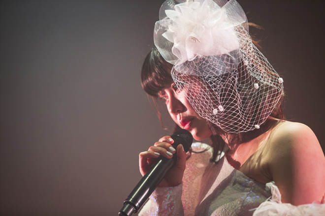 ハンドマイクで歌い、ほんわかとしたムードを作り上げていた「DEKI★NAI」に続いて届けられた「Individual」。オペラの歌唱法も交えつつ、ドラマチックな展開を遂げまくるこの曲は、途中でユニークなお楽しみが待っていた。《受けて立つ!構えなバットを》と歌った直後に「カキーン!」と響き渡ったジャストミートの音。「とった人?」と問いかけられて、「ボールとった!」と挙手した正直者の観客が複数現れた。「すごいねえ。1球しか打ってないのに、何人もいるわけ? 近くに行ってみていいかしら?」とステージを降りたちちゃんはなぜか「ミサコ」を唐突に名乗り始め……「ミサコ、人肌恋しくなっちゃった。誰かの近くで歌を歌いたくなってきちゃった。あの辺にいたわ。ミサコ見たもん」……1階席の通路を通って移動したミサコは、後方エリアに行ってしまったらしい。2階席からは何も見えず、詳細のレポートは断念せざるを得ない状況となってしまったことをここでお断りしておく。しかし、聞こえてくる音声から察するに、カオリという名前の女性のもとへ行ったらしかった。「セクシーダンスに耐えられたらカオリに拍手してあげてくれる?」という声が聞こえてきて、再開された音楽隊の演奏。歌いながらセクシーダンスを踊ったらしいミサコは、やがてステージへと戻っていったので、2階席からも姿が見えるようになった。ステージに上がる時にスタッフに引き上げてもらっていたが、その際に身体がアルファベットのKになっている写真が4月29日の本人のツイートで公開されているので、要チェックだ。こうして文字で先ほどから綴っている展開が怒涛過ぎて「どういうことなの⁉」と混乱している人もいるだろうが、全てが本当に起こった出来事なのだと、臨場感に溢れたKの形からも感じ取ることができるはずだ。