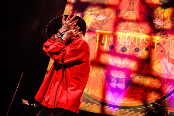 先述の即興展開の最後を飾った「妖艶」は上記のグルーヴ表現が最大限に活かされた名演だった。BPMを微細に揺らしながら生き物のように伸び縮みするリズムの流れと、1960年代のマイルス・デイヴィスにも通じる神秘的なハーモニー(栗原のサックスが特に素晴らしかった)が描く複雑な色彩を、清春のロングトーンが引き受け艶やかに統合していく。このまま何時間でも続いてほしいと思えるような忘我のジャムセッションだったが、直後のMCでは「15秒くらいは満足できた」とのこと。これは謙遜でもあるのだろうし、のめり込みすぎず冷静に舵取りする俯瞰的視点の顕れでもあるのだろう。