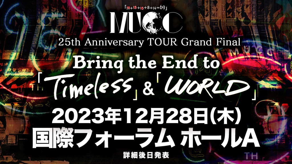 <Timeless>ツアーから集大成へ至る、25周年イヤーの締めくくりとして開催されるのが<MUCC 25th Anniversary TOUR Grand Final Bring the End to「Timeless」&「WORLD」>となる。チケット等の詳細は後日発表。