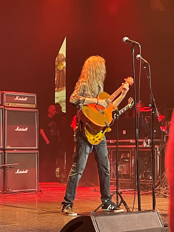 <Monsters of Rock Cruise 2023>ではジョーズのSEから始まり、『2020』からの「Shadow of the Moon」で今の姿を見せる。今回のライブでは、土台となるベース、ドラムのバンドサウンドが実にしっかりとしている。エイドリアンもバンドメンバーも特別な装いではなく自由な印象で、エイドリアンのギタープレイは、ほとんどエフェクトもかけずクリーンで生き生きとしたものだった。
