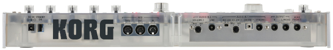 「microKORG Crystal」は、スケルトンの半透明シャーシと、それに合わせた半透明なノブ、操作子類これまでのmicroKORG の構造を一新し、電子回路や内部が見える半透明のシャーシを採用。ノブやダイヤル、ホイールなどの操作子も同じ半透明。記念モデルとしてその名の通り、microKORG を生み出したコルグ・チームのエネルギーや想いを「結晶化」している。