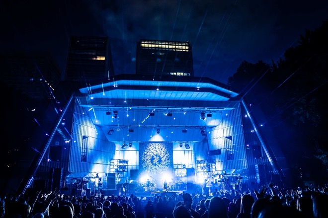 この日、関東地方には朝から強風が吹き荒れていたが、野音は公園の木々のおかげか、強風の影響はそれほどでもない。初夏を告げる暑い日差しが降り注ぎ、むしろ風が心地いいぐらいだ。そんな野音にSEとして『極彩』の1曲目「レイブサーカス」が鳴り響いたのは17時35分のこと。トライバルなリズムに合わせ、オーディエンスはハンドクラップしながら期待を高めるばかり。紫色や黄色など様々なスポットライトが点滅し、まさに極彩色となったステージ。