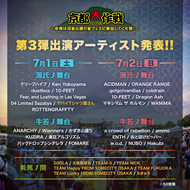 今回の発表では、7月1日の「源氏ノ舞台」にヤバイTシャツ屋さんが出演することが明らかになった。また、「鞍馬ノ間」でバスケットボールのトーナメント戦<京都大作戦杯2023>が開催されることも発表となっている。