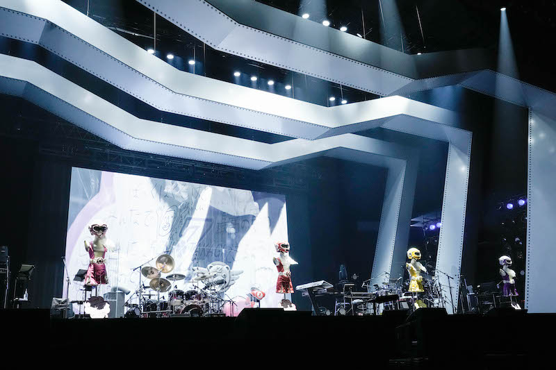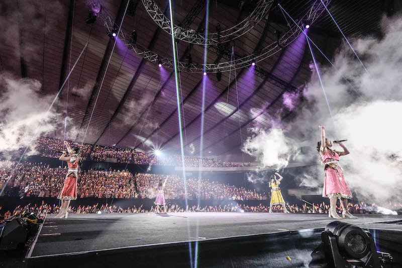 衣装チェンジを経て、後半戦は「Nightmare Before Catharsis」からスタート。この曲もコールがあってこそ完成するライブ曲だ。イントロでメンバーが1人ずつ、ステージ下からポップアップで登場すると、モノノフもコールでそれに応えた。さらに「CONTRADICTION」から「ゴリラパンチ」へと続く。「ゴリラパンチ」も節目には欠かせない重要な1曲。いまだに東京ドームの10周年ライブでの佐々木の歌い出しからの大歓声が忘れられないモノノフも多いことだろう。この曲に乗って、再びトロッコでセンターステージへ移動した。