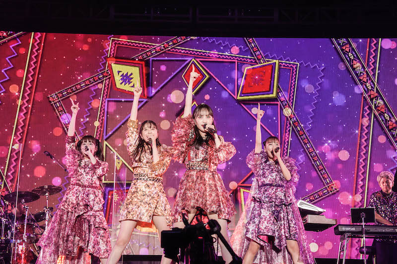 最初のMCパートでは、一緒に活動するようになって今年で10年というダウンタウンももクロバンド(DMB)を紹介した後、恒例の自己紹介へ。久しぶりに会場を巻き込んでの自己紹介で、メンバーのテンションも高まっていく。そして、「準備はいいですかー?」と会場のモノノフを煽り、声出し解禁の喜びを改めて感じながら次のブロックへ。