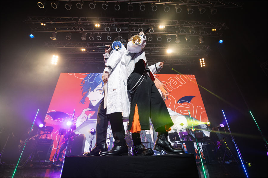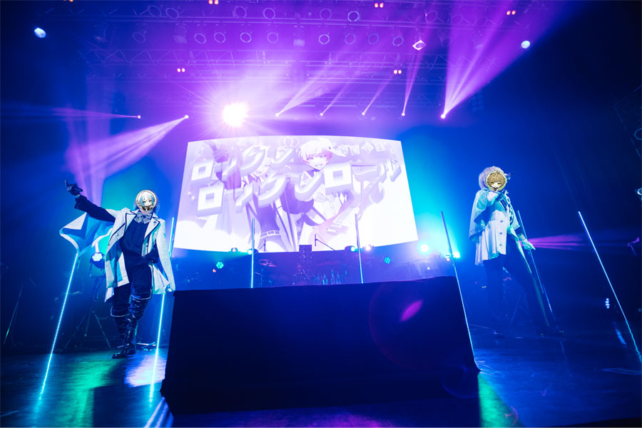 改めて一人ずつ自己紹介をすると、スタンガンの「(次は)誰が歌うんでしょうか!」というフリに、しるばーなとまるぐりが「はい!」と手を挙げる。それを合図にユニット&ソロコーナーへ。しゃけみーとスタンガンがステージを後にすると、しるばーなが「おしゃべりと言ったら僕らみたいなところがあると思うんですけど」とポツリ。まるぐりから「ねぇよ!」とツッコミが入ると、会場に笑いが巻き起こる。「俺たち、珍しく熱い曲やるんですよ。お前らイケんの!?」と声を上げて始まったのは、みきとPの「ロキ」。宣言通り熱いパフォーマンスを終えると、続いてはしるばーなのソロへ。まふまふの「ハローディストピア」でさらに会場のテンションを上げていく。