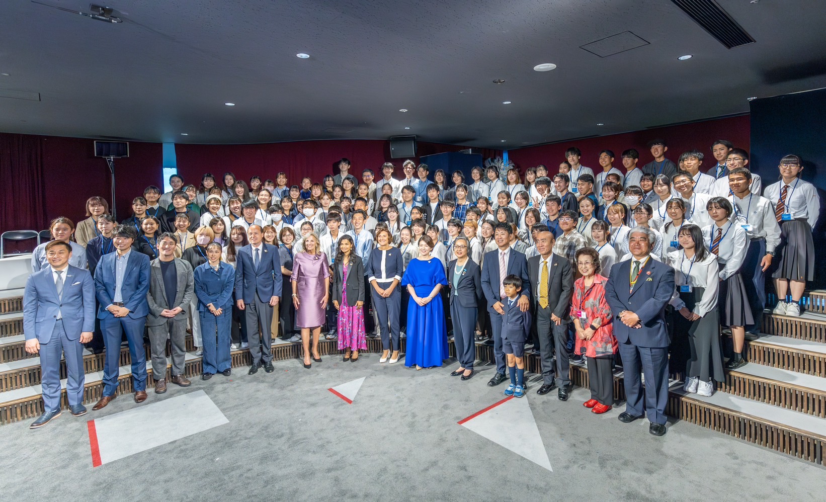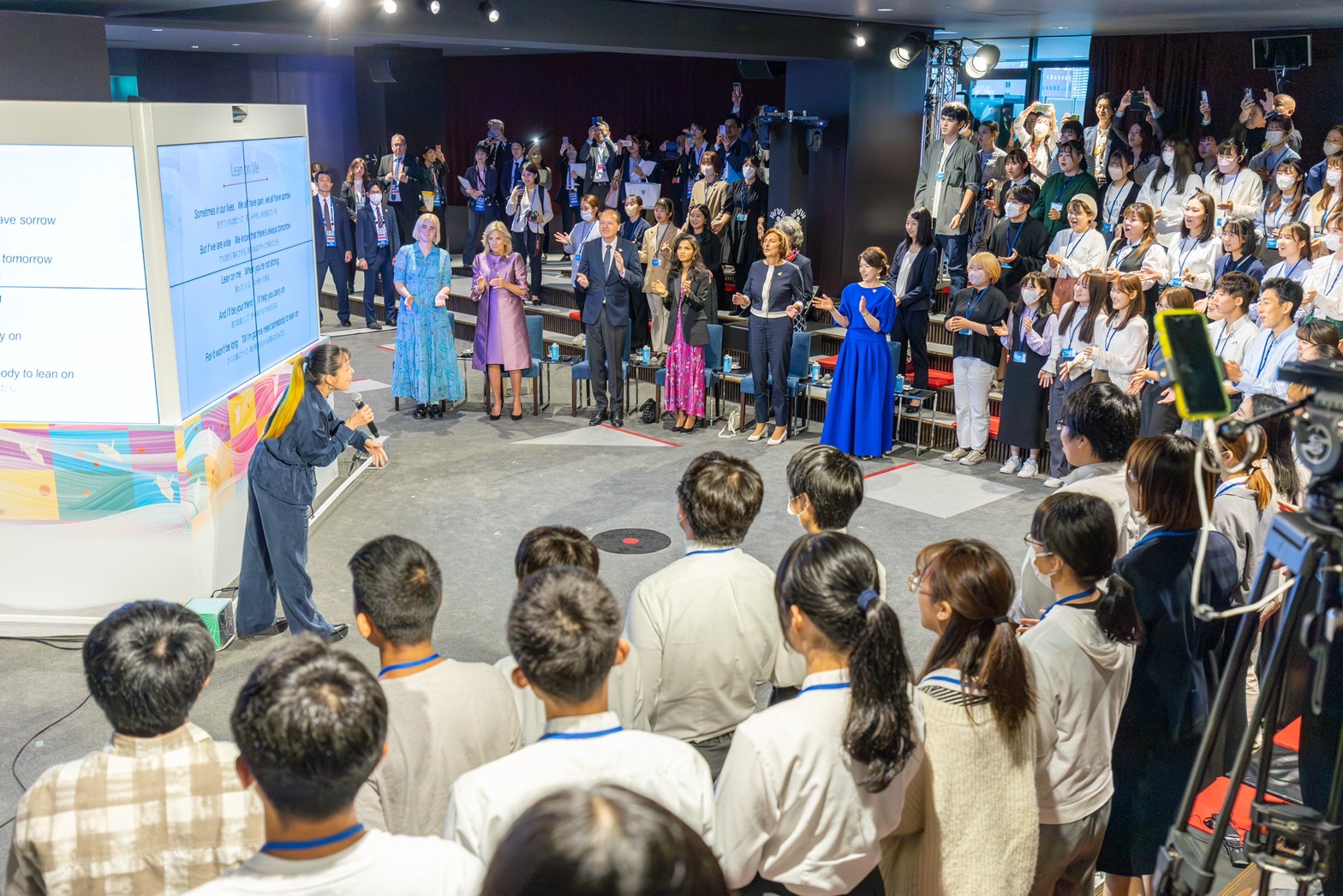 5/19(金)には、岸田裕子首相夫人、ジルバイデン米大統領夫人など各国首脳の配偶者が参加した次世代シンポジウムに広島県内の約100名の学生らと共に出席し、平和への想いを込めたスピーチを行ったAI。その後、学生と一緒に「Lean on Me」を合唱し、平和への想いを届けた。