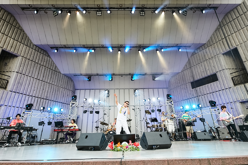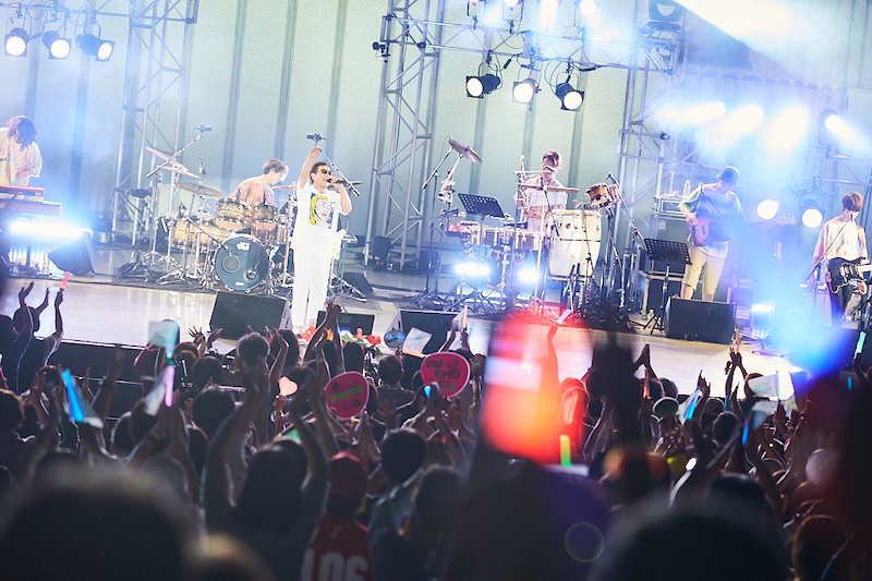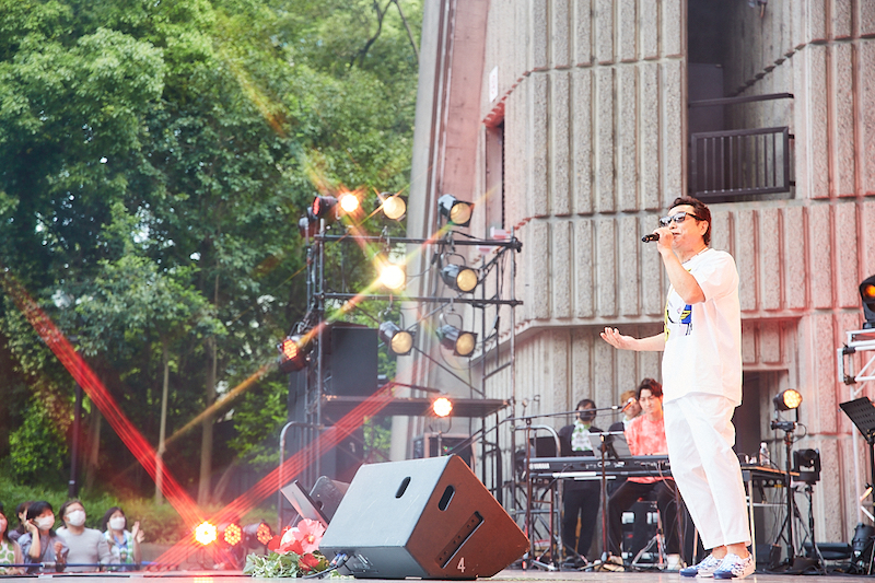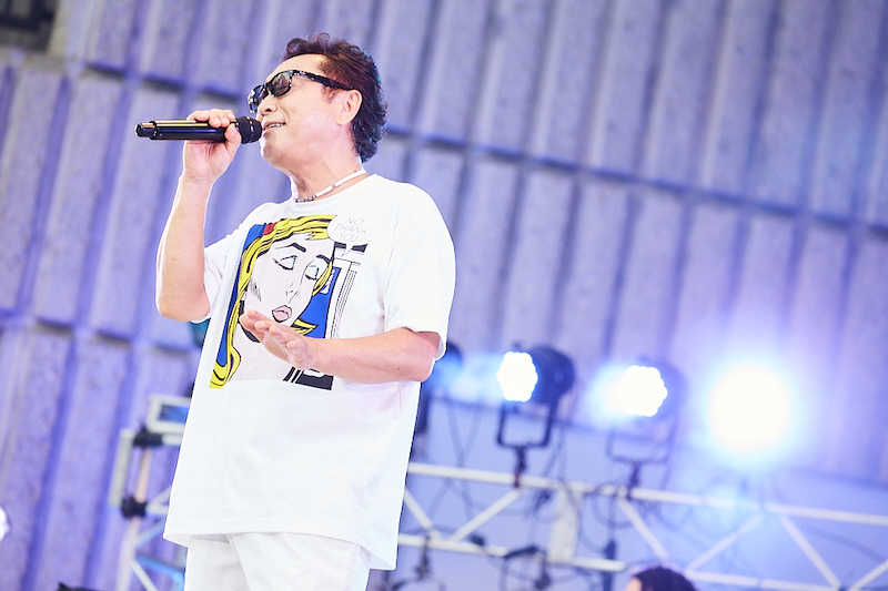 最初のMCでは、「(新型コロナの)規制から解放され、この日を迎えて嬉しく思います」「何が楽しみってこの野音が100年でおいらが40年、こんな日にライブができるなんて最高」と思いのたけをぶつけていく。さらには、「自分のライフスタイルの音楽を今日は持ってきました」「そう、“海”、“南の島”。鬱々とした気持ちを海に投げて、楽しい夏を、という気持ちでのメニューを用意しました」とこの夜の楽曲について期待を持たせ、集まったファンもその言葉に喜びを爆発させる。
