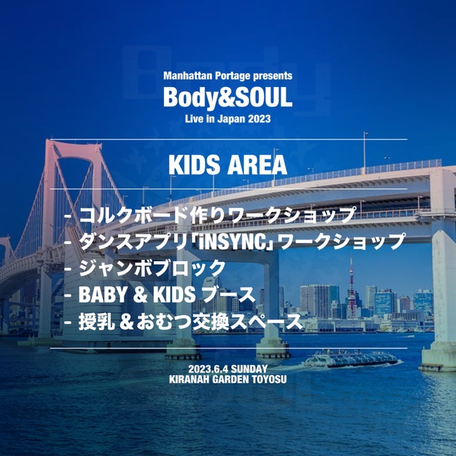 1996年からNYでスタートした<Body&SOUL>。日本では2002年よりvelfarreやageHaなどの大型クラブに始まり、両国国技館や晴海客船ターミナルなど様々な場所で開催されてきた。フランソワK、ダニー・クリヴィット、ジョー・クラウゼルというレジデントDJが1曲ずつミックスするバック・トゥ・バックで奏でるサウンドに多くの人々が歓喜し、音楽の素晴らしさを再認識することができる空間として日本でも愛されているのはご存知の通り。休止期間を経て再始動が予定された2022年もコロナ禍の影響は色濃くDJたちの来日が叶わず延期に… 新たな開催地を求めた2023年、東京湾とレインボーブリッジを望むキラナガーデン豊洲にて<Body&SOUL>が再開。同郷となるNY生まれのブランドManhattan Portageと共に日本では5年振りの開催となる。