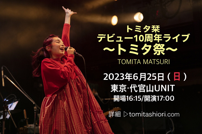 また、デビュー10周年を記念したワンマンライブ<トミタ栞 デビュー10周年ライブ~トミタ祭~>が6月25日に代官山UNITにて開催されることも決定。バンドメンバーは、Gt楢原英介 (VOLA & THE ORIENTAL MACHINE)、Ba.藤本ひかり (ex. 赤い公園)、Dr.YURINA da GOLD DIGGER (Magic, Drums & Love)の面々だ。さらに、お笑い芸人のデッカチャンがゲスト出演することが発表された。同公演にて、「ラーメンウォーアイニー」もライブ初披露する予定だ。