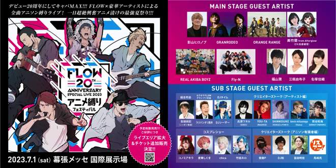 FLOWが7月1日に千葉・幕張メッセ 国際展示場で開催する<FLOW 20th ANNIVERSARY SPECIAL LIVE 2023 ~アニメ縛りフェスティバル~>の出演者の最終発表が行われた。