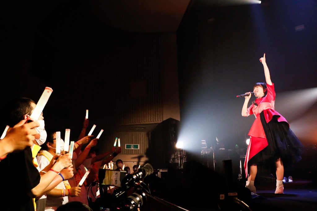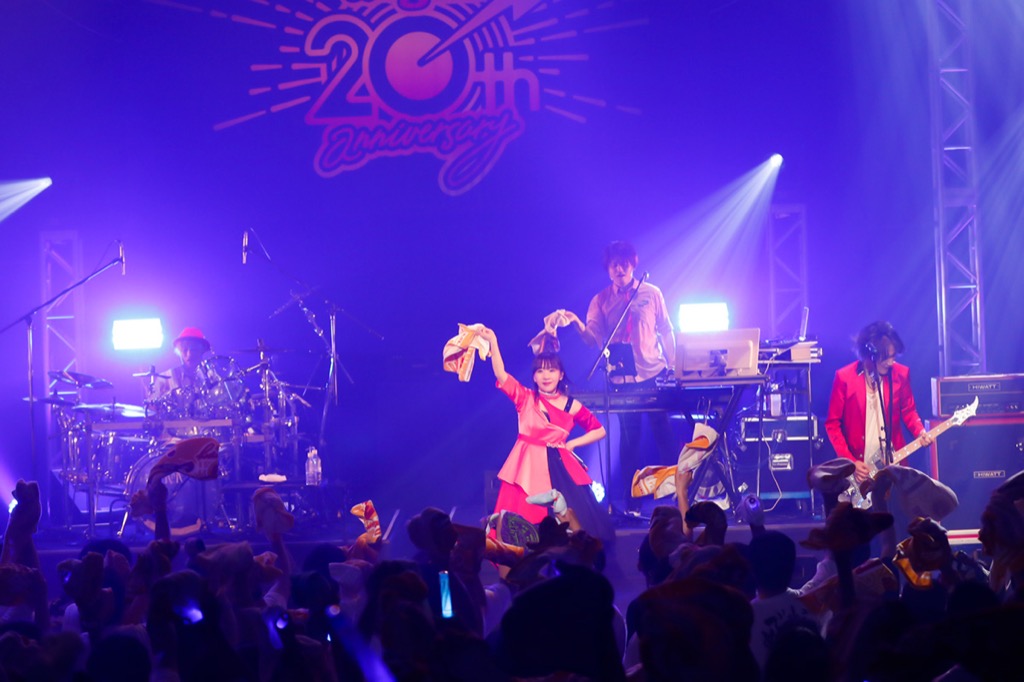 打って変わって最高にハッピーな「cheers!」を、ステージから客席に降りて会場を練り歩き、ぢぇらっ子たちに囲まれながら一番近くで歌を届けた。そしてatsukoが「この曲があったからみんなと出会えて、今日への道が続いています」とこの20周年記念LIVEには欠かすことのできない2013年の1stシングルで、デビュー曲「明日へのbrilliant road」を、会場のファンも一緒に振付を踊り、歌い力強いコールをステージに届ける。緑色のペンライトで染まった会場に金色のテープが放たれ、20周年にあわせて会場全員で20回のジャンプとともに締めた。
