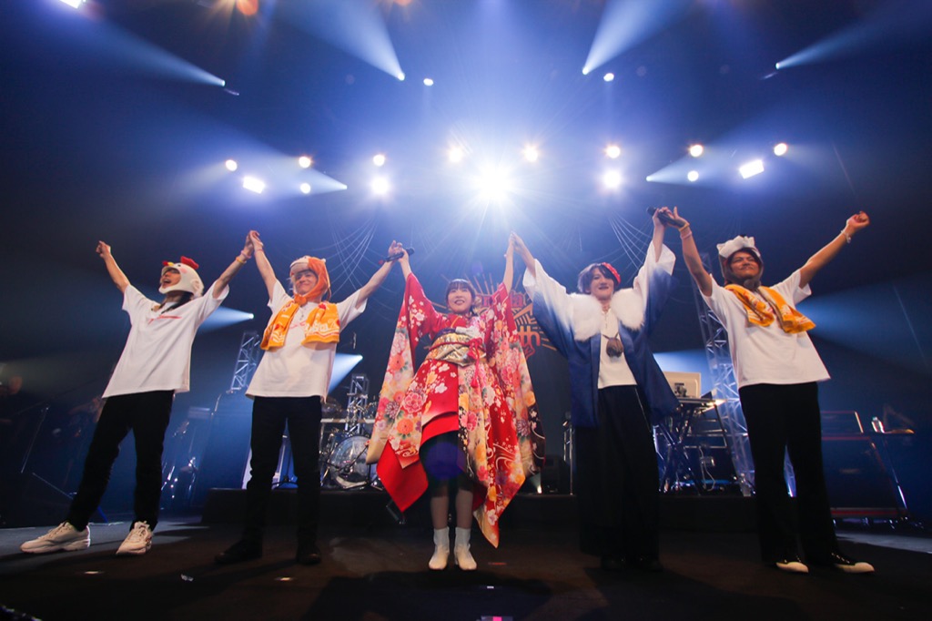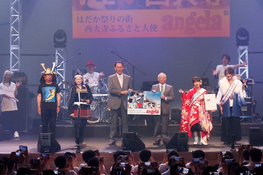 観客からの大きなアンコールに応えて、メンバーが着物風衣装で再登場!Day2公演にもangela20周年をお祝いしたいという特別ゲストが呼び込まれ、西大寺観光協会より大森後藤治会長らが登壇。大森会長よりデビュー20周年をへのお祝いの言葉に加え「西大寺の盛り上げ隊になっていただきたい」と、『はだか祭りの街 西大寺ふるさと大使』へ任命されることに!! atsukoが「もうこうなったら“はだか祭りの街”、一肌脱ぐしかありませんね!!」と快諾し、昨日のDay1に続いて早速ステージ上で任命式が執り行われる。委嘱状とたすきが授与され、大使の特大名刺を受け取ったKATSUが客席へ向け大きく掲げる。atsukoは「こんな未来があるとは思いませんでした!」と驚きとともに地元・西大寺が自分たちを選んでくれたことへ喜びを述べ、KATSUは高校生時代の西大寺エピソードを披露し「西大寺の良さを日本だけではなく世界に伝えていきたい」と意気込んだ。atsukoが「KATSUさんもはだか祭りに出ないとね!」と急な無茶ぶりをするとKATSUは「人前で裸は………やりましょう!!」と応じ、自分だけでなく会場のファンも巻き込んで「俺らが出ないとおかしいよね?出るよねぢぇらっ子!!」とファンたちにも約束を取り付ける。会場中からは昨日の『桃太郎のまち岡山大使』に続いてW大使となったメンバーにさらなる拍手が贈られた。