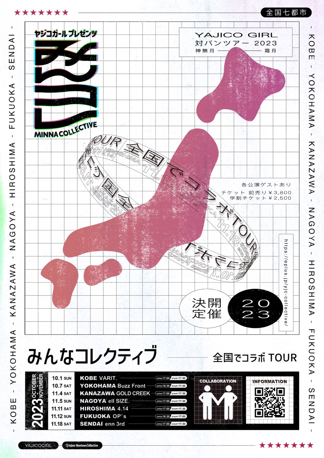 アンコール中のMCにてメンバーから、対バンツアー<みんなコレクティブ ~全国でコラボTOUR~>を開催することが発表された。昨年も行った対バンツアーで、YAJICO GIRLが活動スタンスとして掲げている”Indoor Newtown Collective”の”Collective”にかけて、”繋がり”を感じる近い世代のアーティストを招いて行うというもの。10月1日(月)神戸・VARIT.を皮切りに11月18日(土)仙台・enn 3rdまで全国7都市をまわる。対バン相手は後日発表となる。