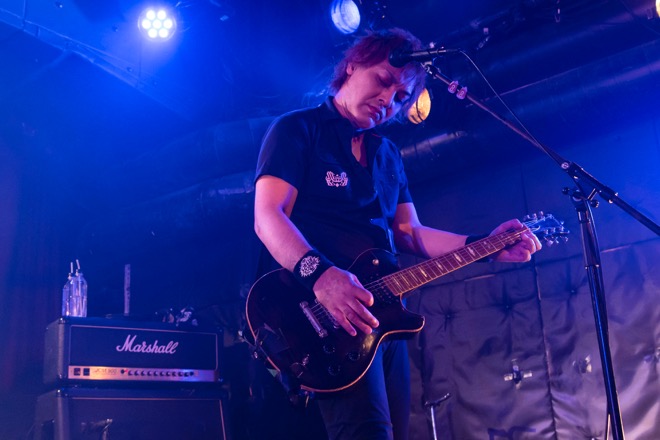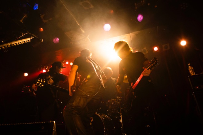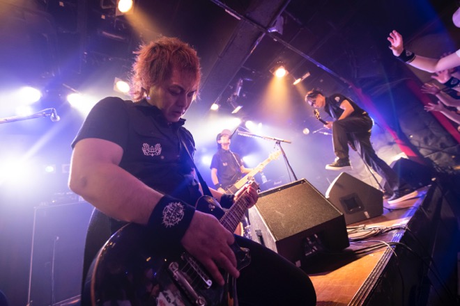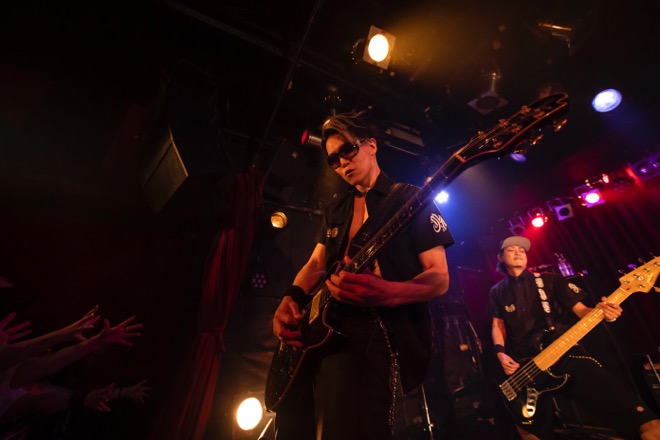 1stステージの開演は16時。ハンドクラップの中、メンバーがHIDEHIROの前に集結し、手を重ねての気合い入れ。SHINPEIが「渋谷Star lounge! 楽しんでいってくれ!」と叫び、のっけから衝動を解き放つように1stアルバム『MUSCLE』収録曲「RUNNER’S HIGH」を投下した。「BURNISH HEART」は重厚なギターリフがフックのサウンドが痛快。後半でSHINPEIとShunpの速弾きギターバトルも飛び出した。
