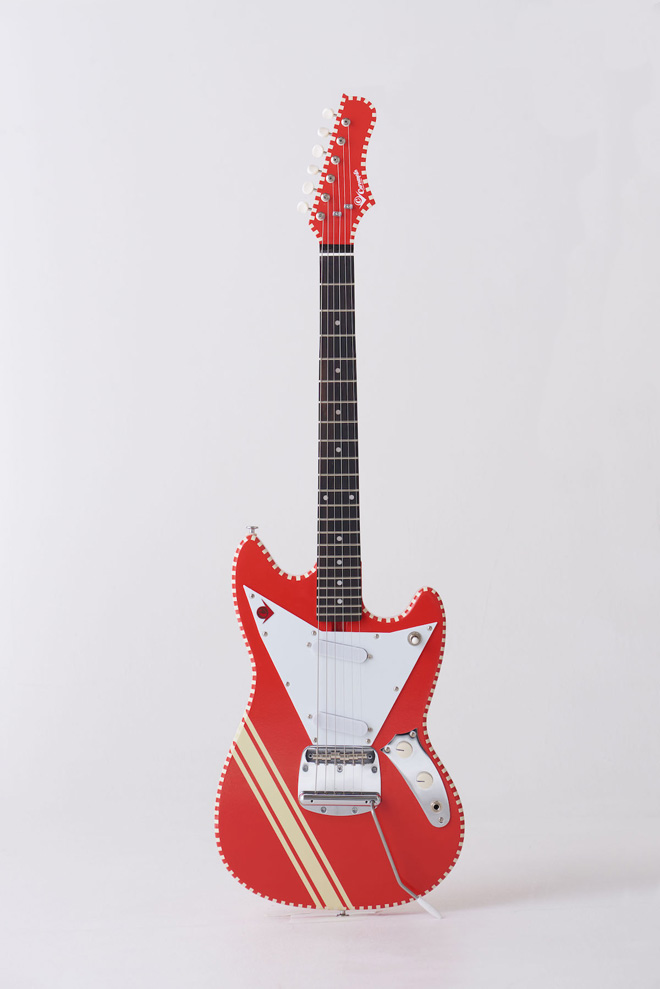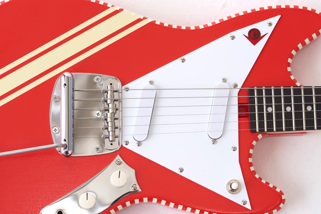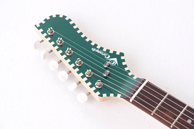 Caramel’s Guitar Kitchenにとって初となるショートスケールで、カラーバリエーションは4タイプが用意されているが、いずれもチェッカードステッチの縁取り塗装やシャープなVラインのピックガードデザインなど、同ブランドらしさ満載のキュートでビビッドな仕上がりが魅力的だ。