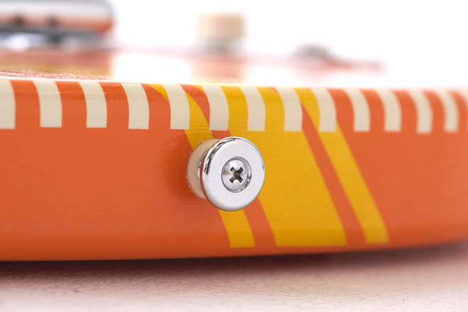 ネックの握り心地も通常よりも細めにシェイピングされている。一方、ストラップピンは激しいライブパフォーマンスでも外れにくい一回り大きいピンをつけるなど、ステージでの使い勝手も細部にわたって配慮されている。塗装は同ブランドで一貫されたハンドメイドによるラッカー塗装で、木材本来の鳴りを大切にした薄い塗膜となっている。傷つきやすいという弱点はあるが、数知れず付くであろう傷自体もギターから醸し出される魅力の一部となる。
