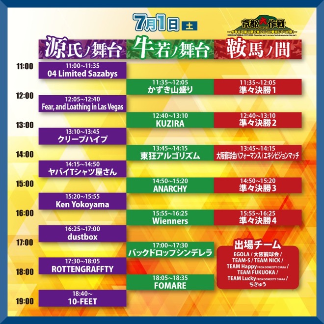 初日、源氏ノ舞台の一番手は04 Limited Sazabys、牛若ノ舞台の一番手はかずき山盛り。2日目、源氏ノ舞台の一番手はWANIMA、牛若ノ舞台の一番手はENTH。両日共、源氏ノ舞台のトリは10-FEETが務める。