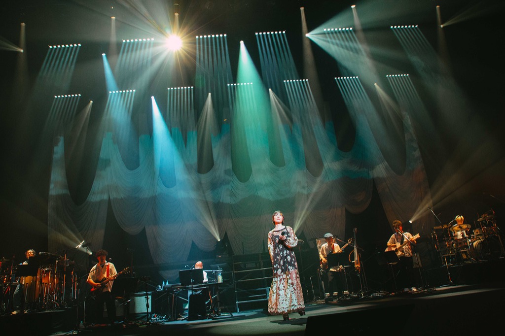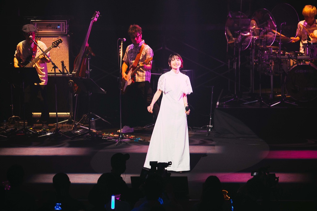 7曲目の「ダエンケイ」からは、少ししっとりとした雰囲気に。アコースティックVer.として演奏された「あたらしいうた」や、海の中を連想させる演出と相まって神秘的な雰囲気を醸し出していた「眠るサカナ」など、花澤さんの心地いい歌声にそっと優しく包まれているような気分になってくる。そこから「星結ぶとき」「息吹 イン ザ ウィンド」と徐々にギアを上げてきて、衣装チェンジ後に披露した「Circle」で会場をよりいっそう盛り上げる。ここから始まる後半戦も、さらに楽しい時間になることは間違いない。