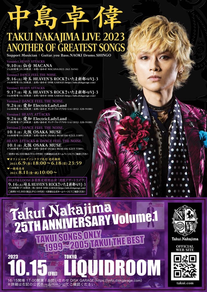 同ツアーにはセットリストを2パターン用意。ひとつは“Version1 HEAVY ATTACKS”、もうひとつは“Version2 DANCE FEEL THE NOISE.”と題して行われるほか、FC限定公演“別腹デザートライヴ”も実施されるなど、様々なスタイルを楽しむことが可能だ。さらに、ツアー最終日となる10月15日の恵比寿LIQUIDROOM公演は、<TAKUI NAKAJIMA 25TH ANNIVERSARY Volume.1TAKUI SONGS ONLY 1999〜2005 TAKUI THE BEST>と題して、デビュー25周年イヤーの幕開けを告げる特別公演となる。
