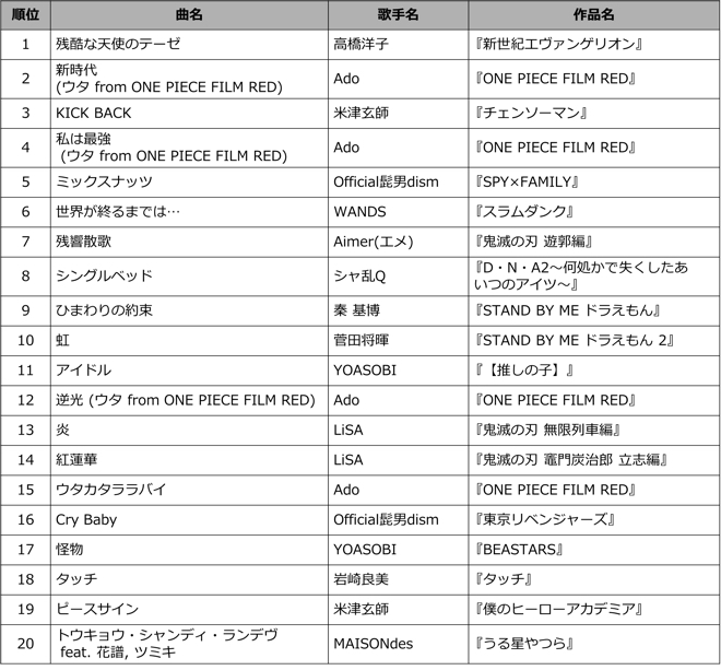 アニメ楽曲ランキングでは、定番曲となっている『新世紀エヴァンゲリオン』の主題歌「残酷な天使のテーゼ」のほか、映画『ONE PIECE FILM RED』の主題歌「新時代 (ウタ from ONE PIECE FILM RED)」や『チェンソーマン』のオープニングテーマ「KICK BACK」が上位にランクイン。映画『THE FIRST SLAM DUNK』の大ヒットと連動するように、テレビアニメ『SLAM DUNK』のテーマ曲に採用されたWANDSの 「世界が終るまでは…」が12位から6位へ順位を上げている。