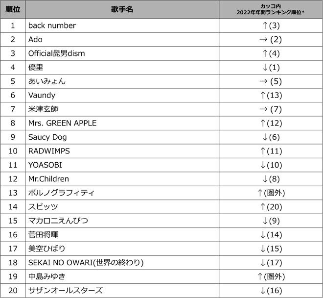 歌手別ランキング1位のback numberは「水平線」や「高嶺の花子さん」などの楽曲が人気を集めたという。また、ポルノグラフィティ(13位)と中島みゆき(19位)の2アーティストが、それぞれ2022年年間ランキングの圏外から浮上しトップ20入りを果たした。