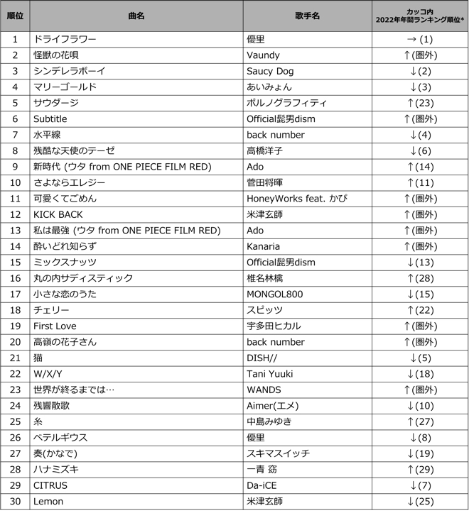 楽曲別ランキングで優里の「ドライフラワー」が1位に輝くのは、2021年上半期、2021年年間、2022年上半期、2022年年間に続いてこれが5回目。2位には、2022年末の『NHK紅白歌合戦』でも注目を浴びたVaundyの「怪獣の花唄」が圏外から急浮上した。このほか、ドラマ『silent』の主題歌に採用されたOfficial髭男dismの「Subtitle」が6位、SNS上でも人気のHoneyWorks feat. かぴの「可愛くてごめん」が11位と、それぞれ圏外から大きく浮上している。