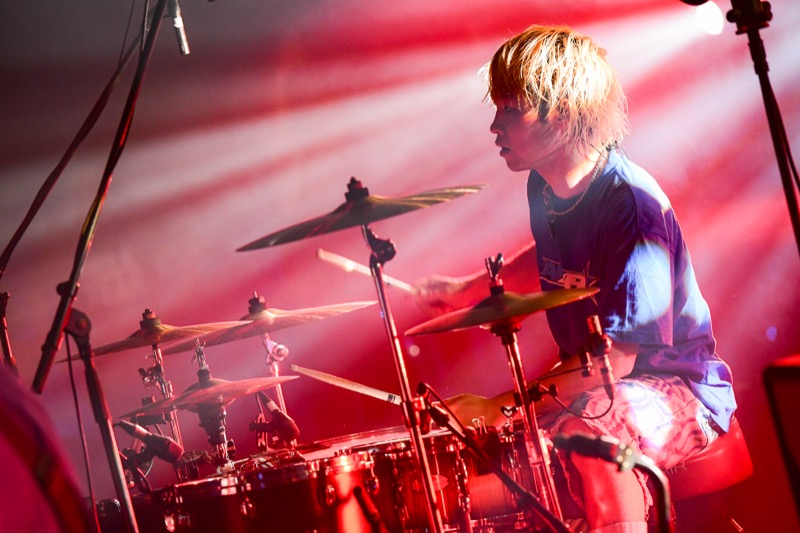 「ここからもう一段階上げていきます!」とJUBEEが声を上げ、ハードコアを思わせる轟音のギター・リフとともにJUBEEのシャウトが炸裂する「GOD」からラッパーのkZmをゲストに迎えた「DENGEKI feat. kZm」に繋げると、観客のダイブが始まった。その光景を目の当たりにしたJUBEEが快哉を叫ぶ。「ロックの景色を見せたいと思って、kZmを呼んだんだけど、たぶん、あいつ食らってたと思う!」──選曲の妙なのか、メンバー達の肩の力が抜けたのか、そこからライブの流れが変わったのは明らかだった。
