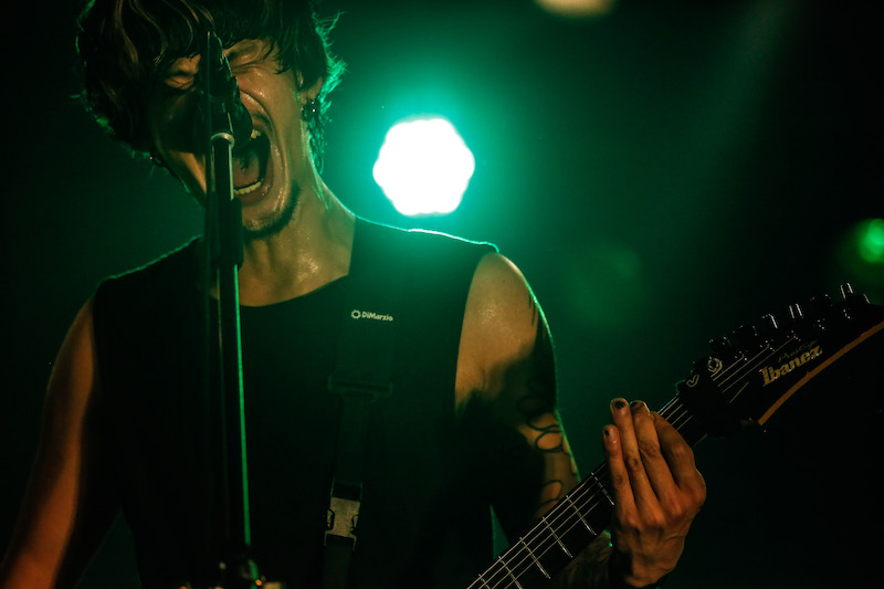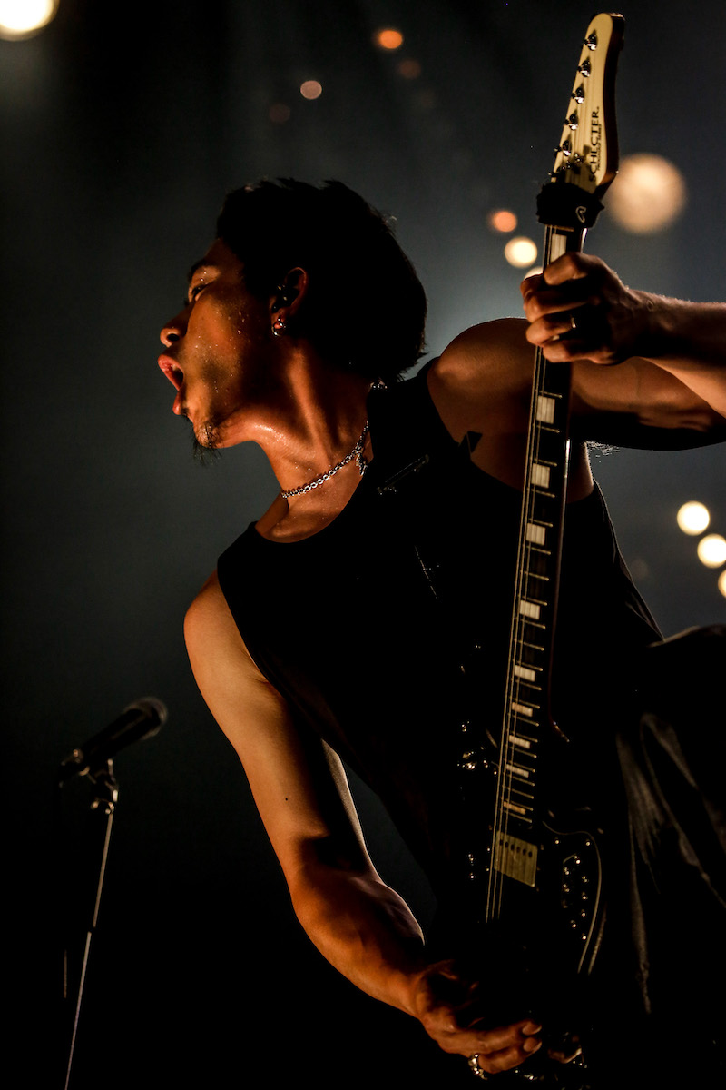 赤いライトを背に、Yosh(Vo)がブチ切れ上等のシャウトとメロディアスな歌声を轟かせ、異なるカラーをシームレスに行き来する高性能っぷりを披露。荒ぶりながらも的確なプレイも相まって、序盤からオーディエンスを引っ張っていく。