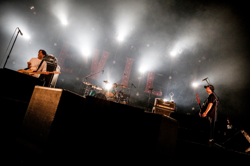 「サタニック、よろしくお願いします」庵原将平(Vo, B)が軽く挨拶をした直後のこと。松崎兵太(G, Cho)の弾くコード・ストロークに、将平が歌を重ね合わせていった。するとフロアを埋め尽くしたオーディエンスも一緒になって大合唱を巻き起こした。感動的なほどの一体感にすでに包まれたEVIL STAGE。池本雄季(Dr, Cho)がリズムを刻み始め、曲のBPMが一気に高まると、オーディエンスの熱気もやる気も飛ぶ気も急上昇。こうして肩車からのクラウドサーファーが飛び交う中で始まったのがSHANKのライブだった。