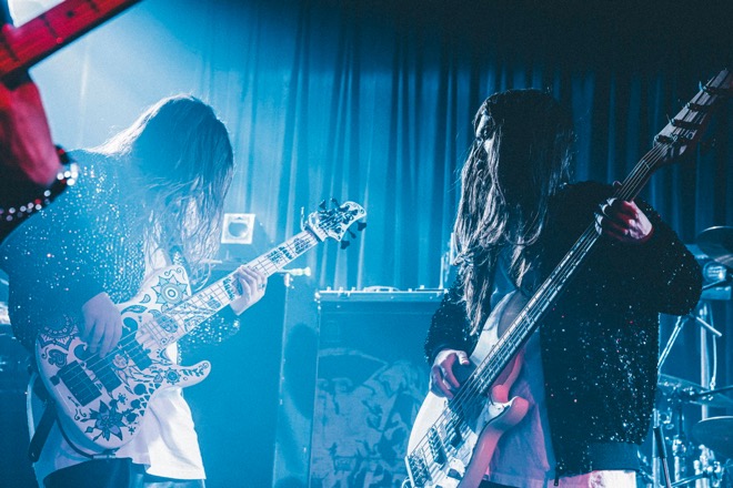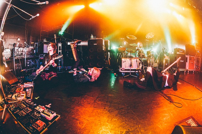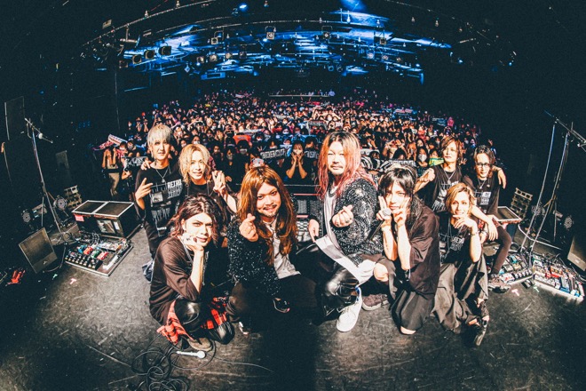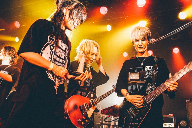 休む間もなく始まった「大塚ヘッドロック」ではvistlipの海がゲストとして登場。千秋に「vistlipの眼鏡っ子」と紹介された海は、ステージに現れて早々、千秋に蹴りを入れて教育。曲中にも向かい合ってギターを弾くなど仲の良さが垣間見える。そんな中、フロアでは横モッシュ改め“奇跡の大移動(千秋命名)”が起こり、ステージ下手ではSacchan(B)と海がなぜかX JAPANの「紅」をリコーダーで吹くなど、まさにカオスな空間が出来上がっていた。