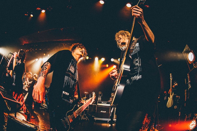 再び会場に火をつけたのは、「DANCE IN THE DARK」。観客はもちろん、メンバーも髪を振り乱し、ステージ上を縦横無尽に駆け回る。フロアもステージ上も本能を剥き出しにしてどんどんと熱が高まっていく中、「Timer」を投下。「オイ! オイ!」と叫びながら拳を突き上げる観客たちからはすさまじい気迫が伝わってくる。さらに、「LION HEART」、「彩」と続けざまにライヴで定番の暴れ曲を披露し、最後まで熱狂の渦を巻き起こし続けた。