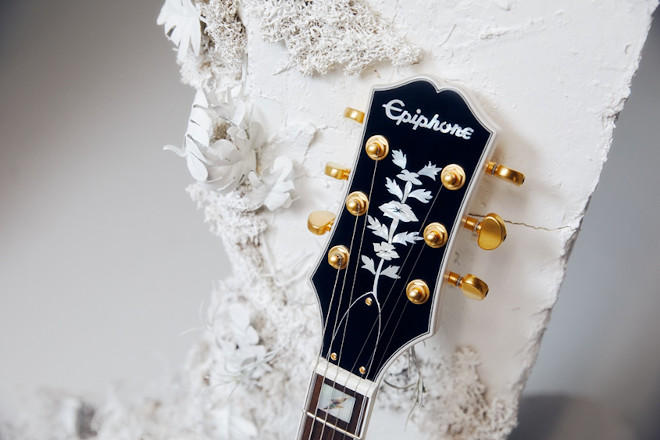 『エミリー・ウォルフ“ホワイト・ウォルフ”シェラトン』の指板にはインディアン・ローレル材が使用され、22フレット仕様のミディアムジャンボフレットとアバロン・ライトニングボルトをあしらったマザー・オブ・パールのブロックインレイが採用。ヘッドストックは60年代に人気を博したカラマズー・シェイプで、表面にはマザー・オブ・パールのツリー・オブ・ライフ・インレイ、裏面にはエミリー・ウォルフのロゴが施され、Grover RotomaticチューニングマシンとGraph Techナットが採用。Epiphone Lock Tone Tune-O-Maticブリッジとストップバー・テールピース搭載により、サスティン感を生みだす。