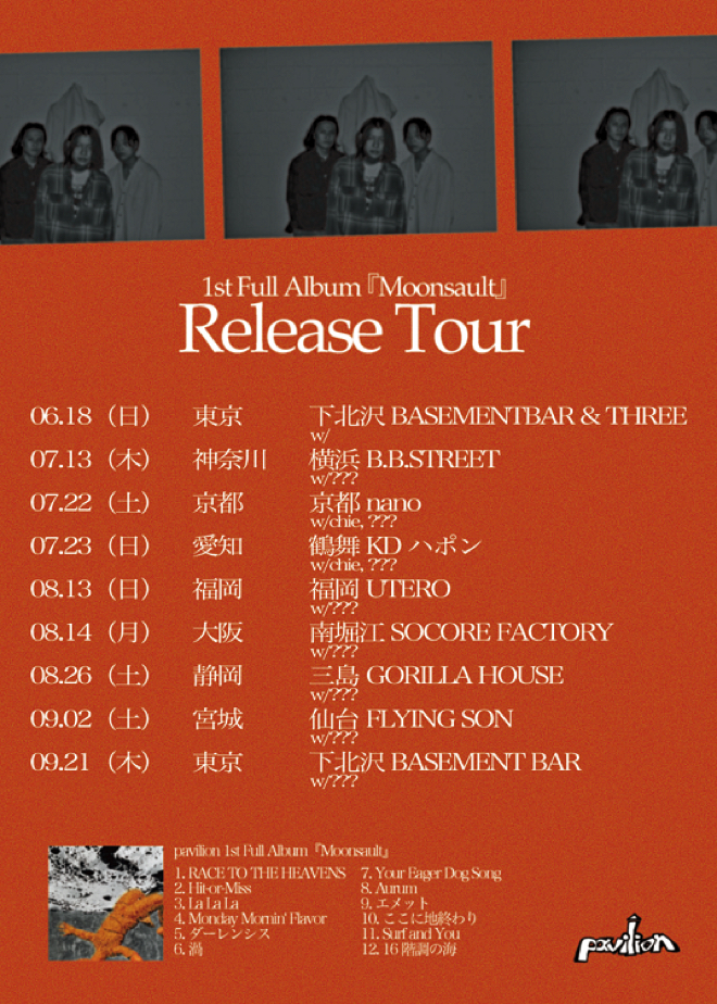 <pavilion 1st Full Album『Moonsault』Release Tour>は、1stフルアルバム『Moonsault』のリリースに伴い開催されるpavilionにとって初めての全国ツアー。pavilionはこれまでTENDOUJIが主催するイベントやツアーに招かれ対バンを重ねてきたが、今回は自身の公演で先輩の胸を借りる形となる。