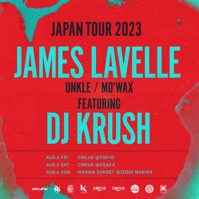 Moʼ Waxの首謀者、UNKLEのリーダーJAMES LAVELLE (UNKLE/Mo’ Wax)と、日本を代表する実力派として様々なメディアで活躍するDJ KRUSHによるジャパンツアーが、8月4日(月)CIRCUS TOKYO 、8月5日(土)CIRCUS OSAKA 、8月6日(日)MARINA SUNSET @逗子マリーナで開催決定!!!