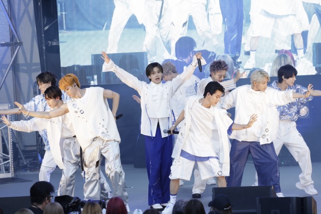 事前にオフィシャルサイトで告知されていたとおり、今回の2公演は、メインボーカルを務めるメンバーのひとりであるKEVINが、腰椎椎間板ヘルニアおよび坐骨神経痛と診断されたため出演を見合わせることに。BUDDiiSは9人で初の野外ライブに臨んだ。